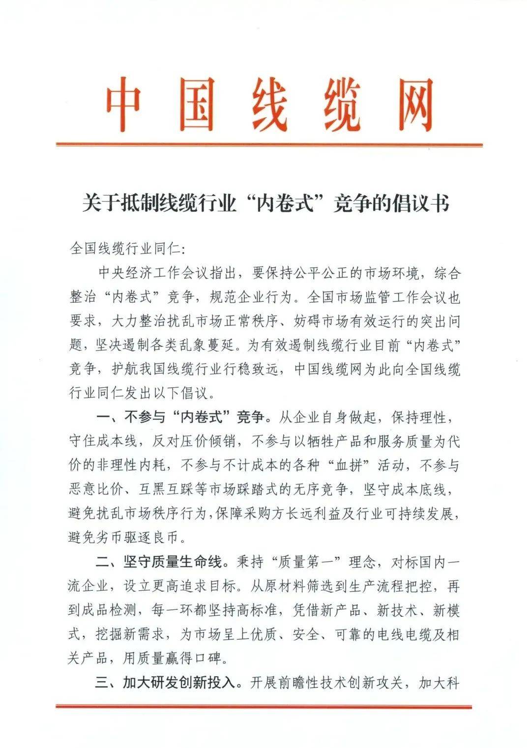 如今,電線電纜行業“內卷式”競爭問題日益突出。它像一個無形的漩渦,將諸多參與者卷入一場不計成本的非理性內耗之中,不僅給企業自身的健康發展戴上了沉重枷鎖,更對諸多行業的穩健前行乃至整個經濟生態造成了負面影響。今日,中國線纜網向全國線纜行業同仁發出《關于抵制線纜行業“內卷式”競爭的倡議書》,呼吁抵制“內卷式”競爭,倡導行業自律,攜手推動高質量發展。